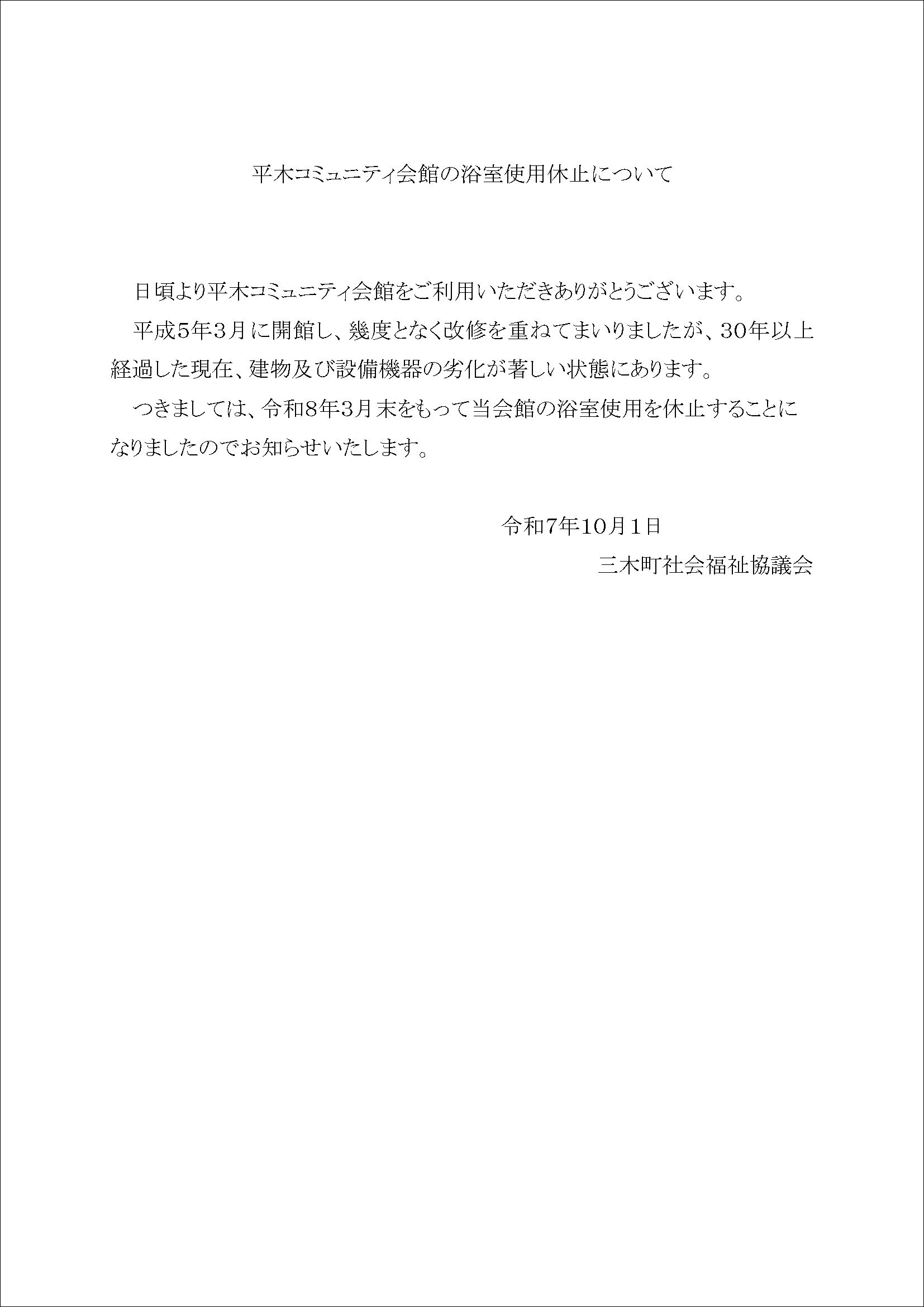 日頃より平木コミュニティ会館をご利用いただきありがとうございます。 平成5年3月に開館し、幾度となく改修を重ねてまいりましたが、30年以上経過した現在、建物及び設備機器の劣化が著しい状態にあります。 つきましては、令和8年3月末をもって当会館の浴室使用を休止することになりましたのでお知らせいたします。